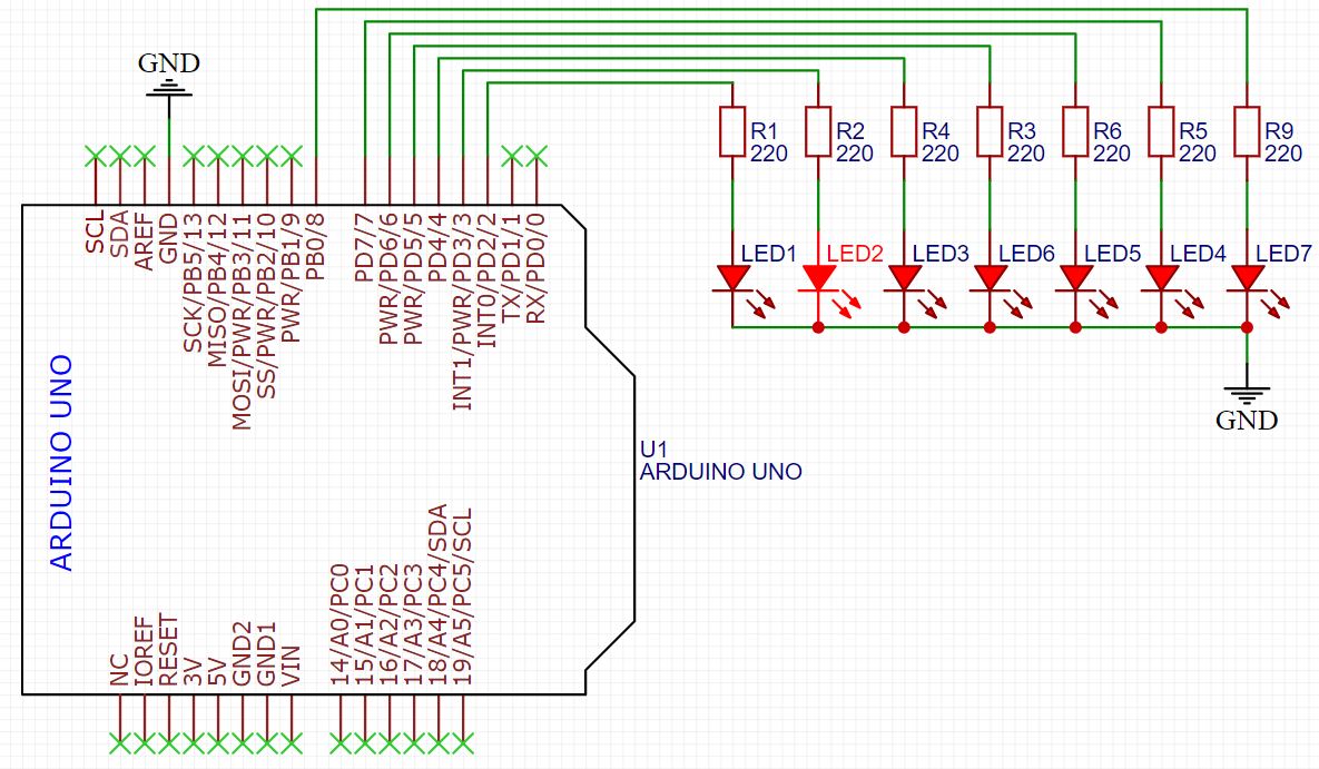 Собрать указанную схему на макетной плате. Написать скетч для микроконтроллера, имитирующий работу автомобильного светодиодного указателя поворотов: последовательное включение всех светодиодов (с интервалом 50мс), после включения всей шкалы - одновременное выключение светодиодов. Повтор включения через 450мс.