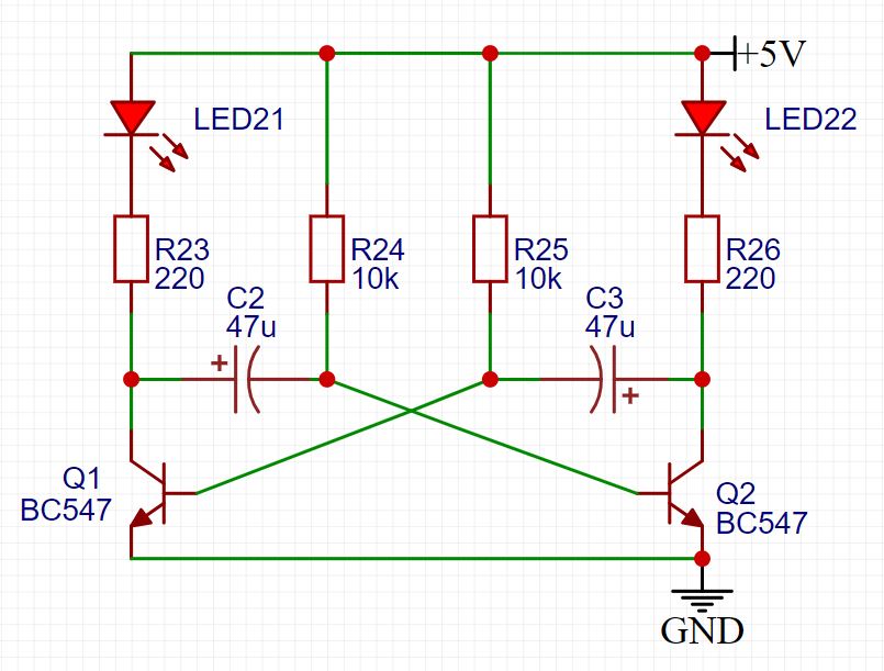 Собрать схему на макетной плате, продемонстрировать работоспособность схемы. Не подавать на схему напряжение более 5 вольт. Мигание светодиодов должно быть полностью симметричным!