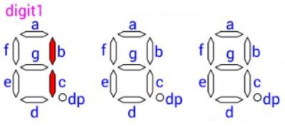 Для выполнения задания используйте динамическую индикацию с общим катодом. Например, нам необходимо отобразить число 198. Для этого следует в первый момент времени подать высокий потенциал на аноды сегментов, образующих единицу – b и c, а на общий катод первого разряда подать низкий потенциал. Общие катоды оставшихся двух разрядов – digit2, digit3 остаются не подключенными (высокий сигнал).