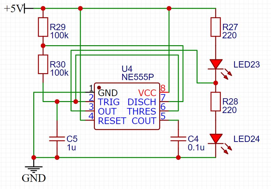 Собрать схему на макетной плате, продемонстрировать работоспособность схемы. Не подавать на схему напряжение более 5 вольт. Мигание светодиодов должно быть полностью симметричным!