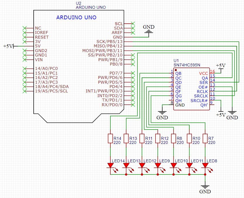 Собрать схему на макетной плате с использованием сдвигового регистра 74HC595.