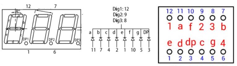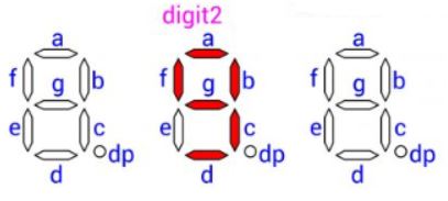 Для выполнения задания используйте динамическую индикацию с общим катодом. Например, нам необходимо отобразить число 198. Для этого следует в первый момент времени подать высокий потенциал на аноды сегментов, образующих единицу – b и c, а на общий катод первого разряда подать низкий потенциал. Общие катоды оставшихся двух разрядов – digit2, digit3 остаются не подключенными (высокий сигнал).